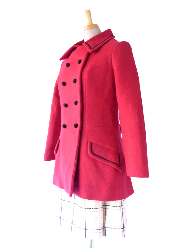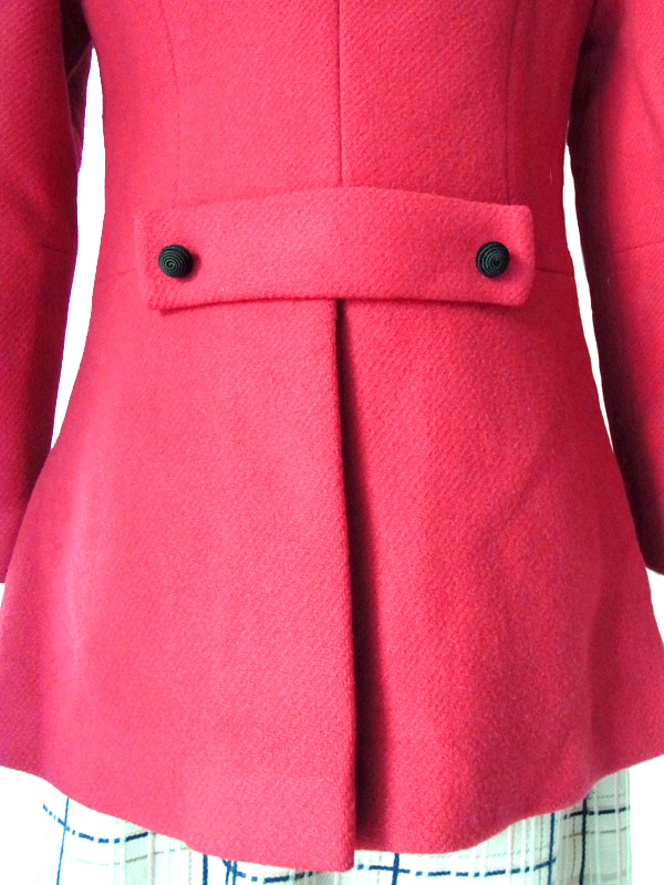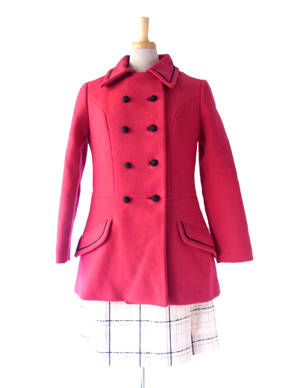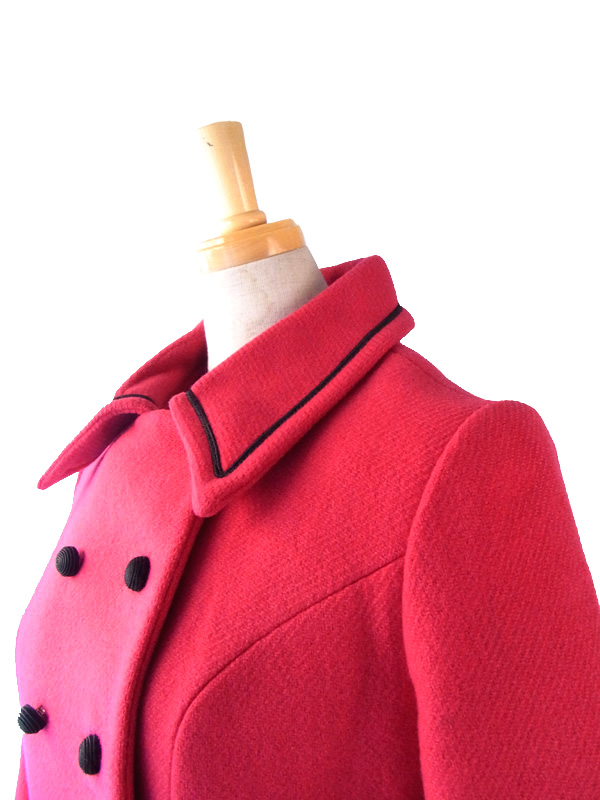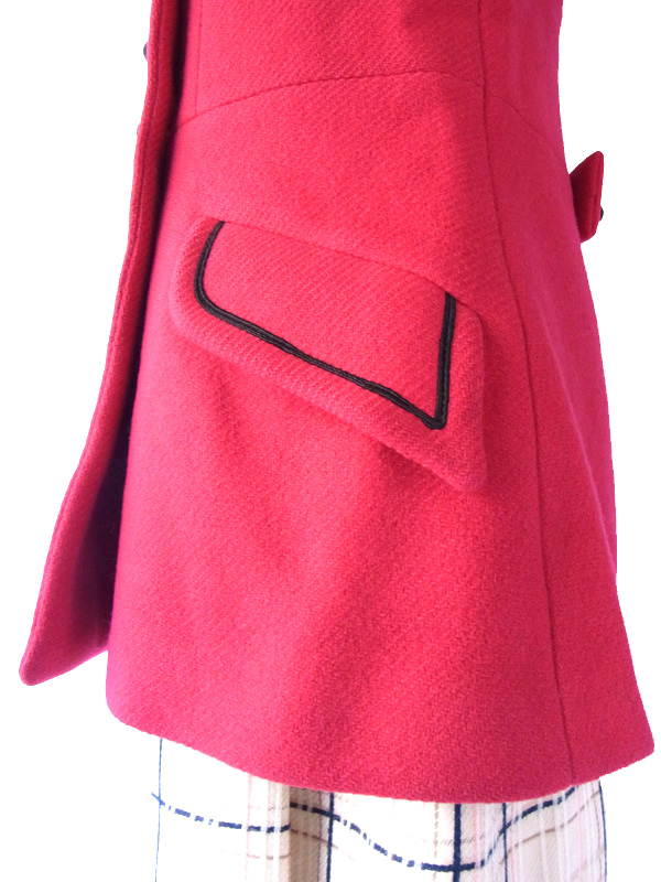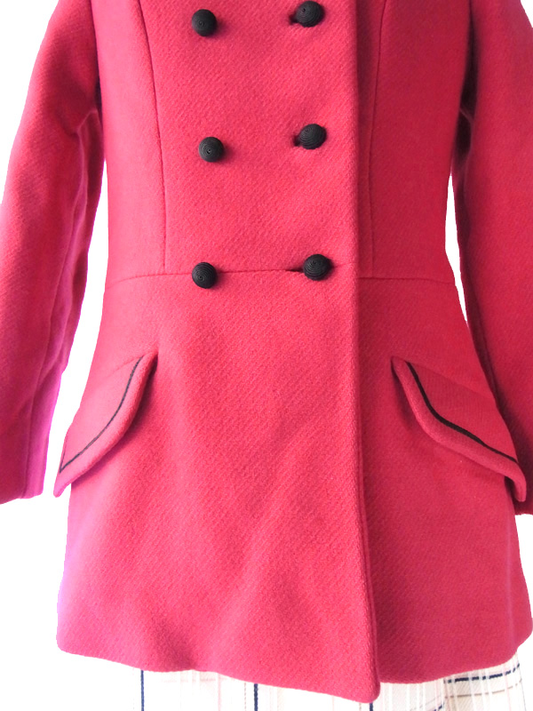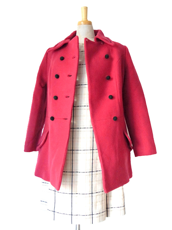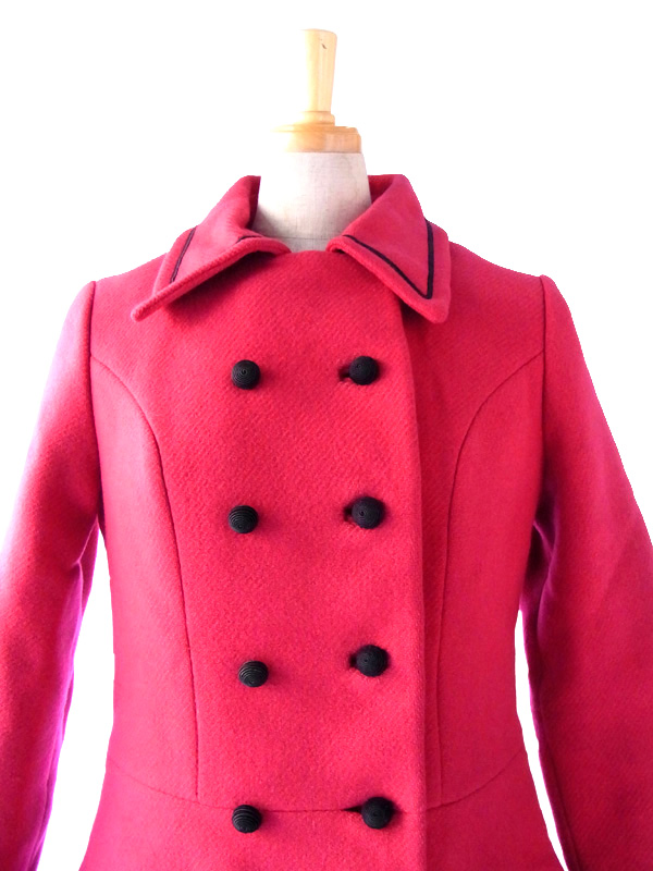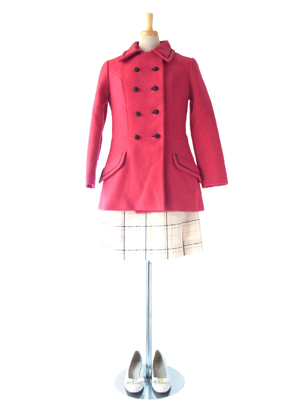 スウィンギン・ロンドンなカラーリングとデザインが最高にキュートな60年代製コートジャケット 60'sヴィンテージならではのかわいらしいライン、キュートなピンクの配色が圧倒的に美しい逸品です。 キュートなデザインボタン、 襟周り、ポケット部分のパイピングがかわいらしいアクセントになっています。 前ボタン留めで胸元にホックが二つ付いています。 デザイン、シルエットも申し分のないしっかりしたつくりになっており、状態は新品同然、とにかくオススメです。 素材はウール、柔らかな厚みのある素材、滑らかな肌触りで、着心地も優れいています。 丈やサイズのバランスがよく、とても可愛らしいお品ものです。