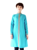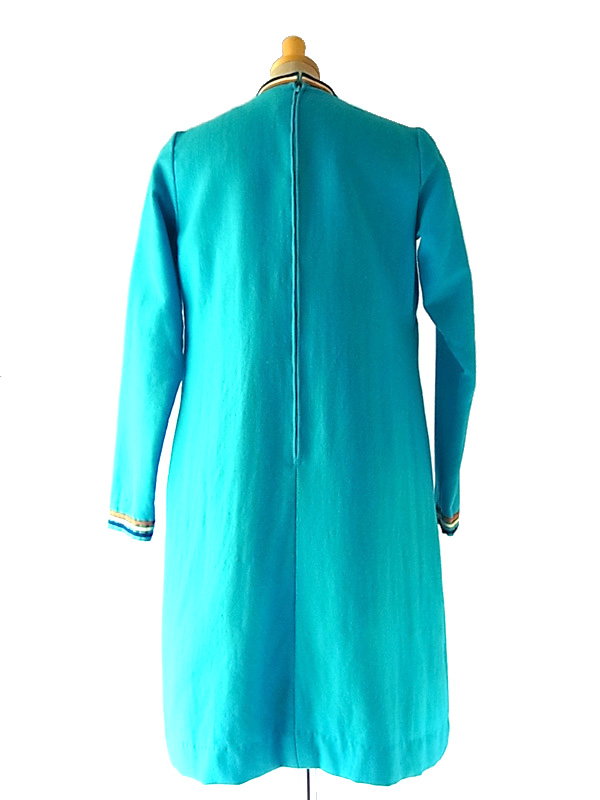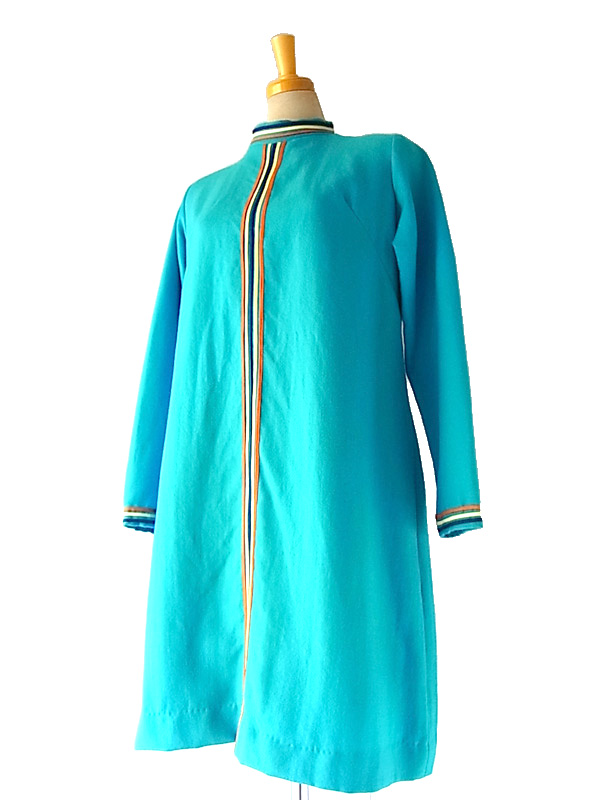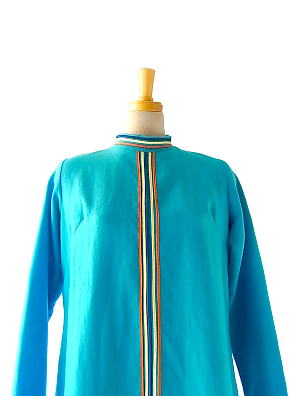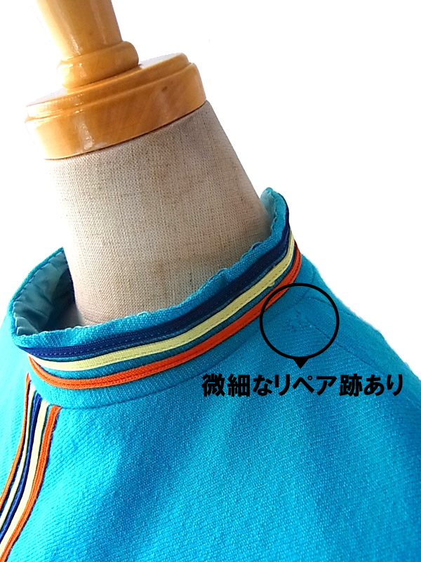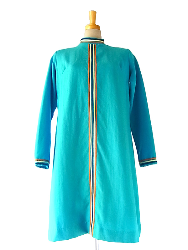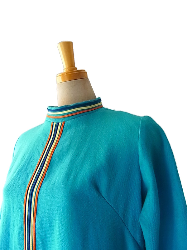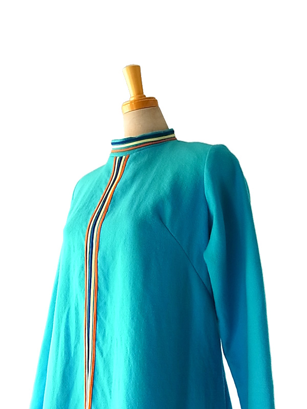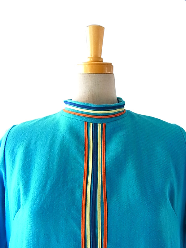 60年代気分♪キュートなベイビーブルーとデザインが目を引くフランス買付けウールワンピ 綺麗なベイビーブルーのボディーにイエロー、ブルー、オレンジのライニングが大変かわいらしいお品物。 ファネルネックラインで、レトロな可愛らしいラインを引き立てています。 素材はウールで、柔らかな生地、厚めの仕立てになっています。 左肩、スカート左にリペア跡がありますが、着用時に特に問題のあるレベルではありません。 古着のため若干の使用感、特に目立たないほころびなどありますが、着用時に問題はありません。