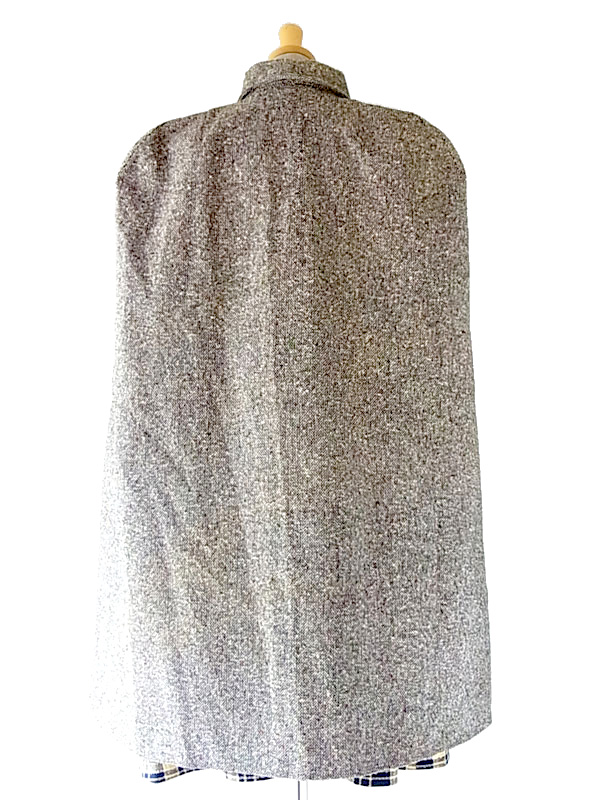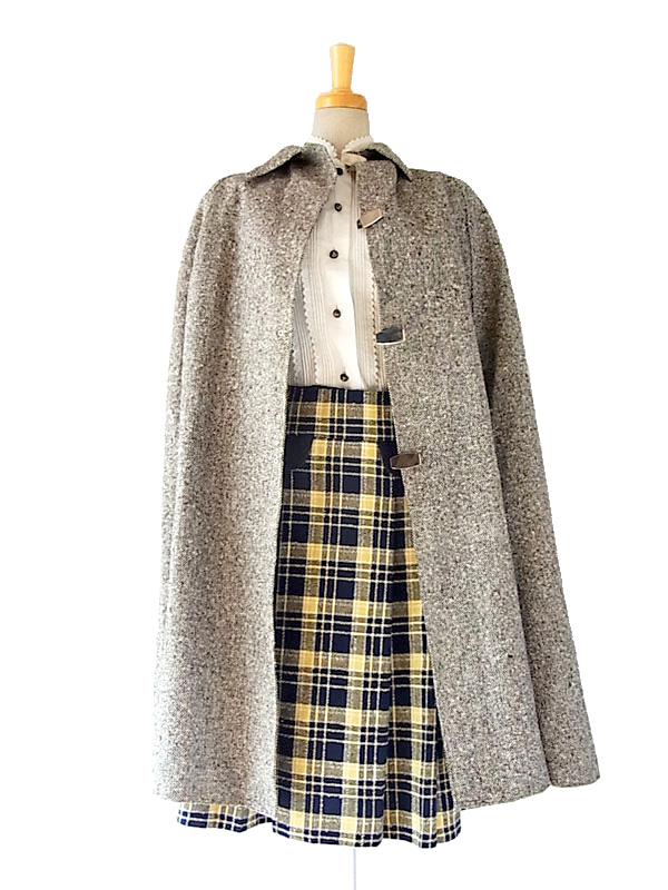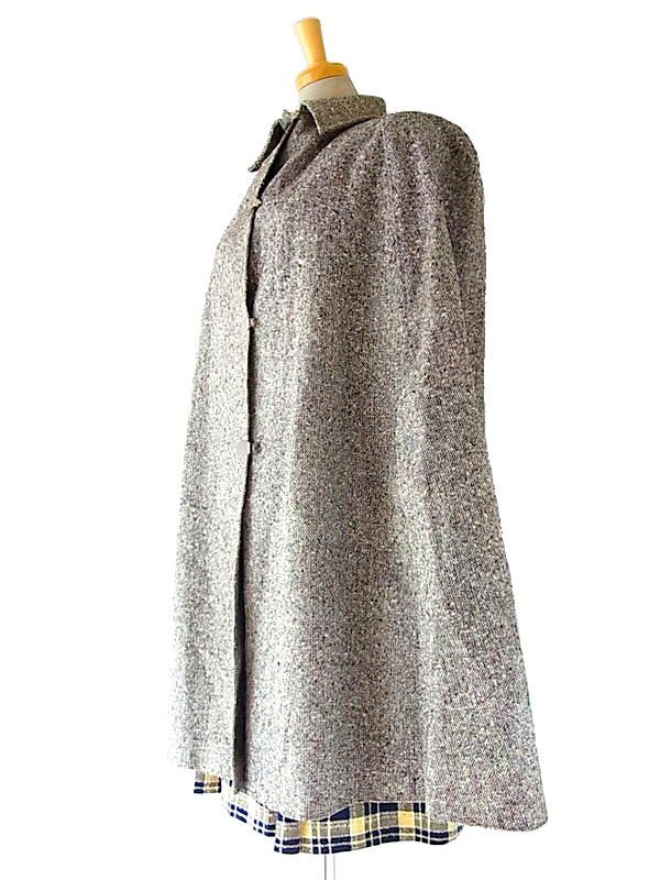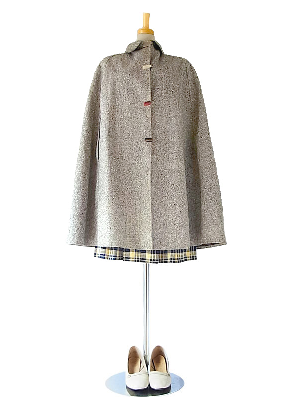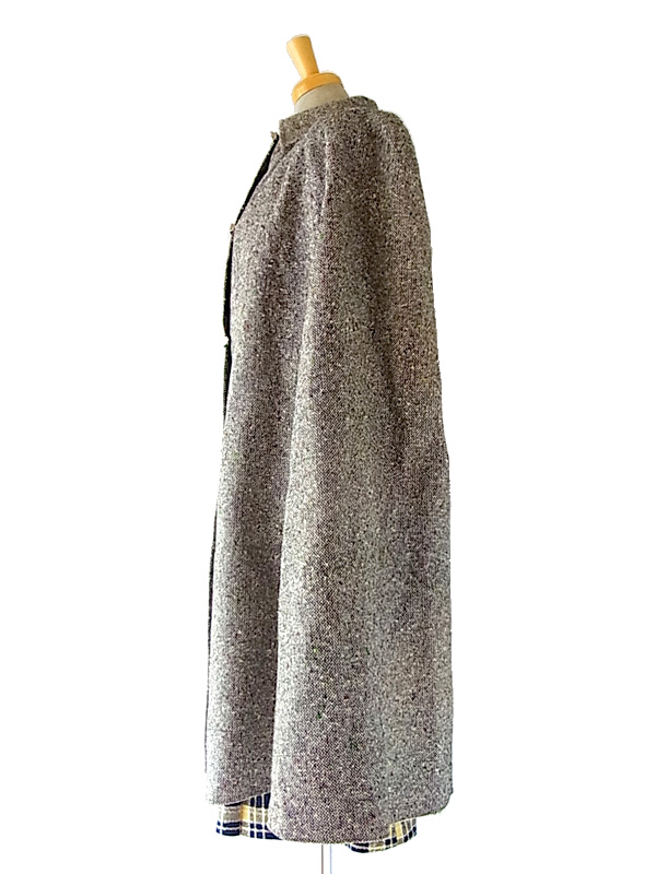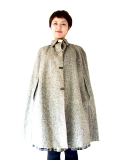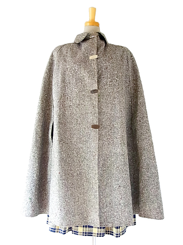 秋冬のコーデをクラシックに演出してくれる上品なツイードケープコート 軽量なので、軽く羽織っていただけます。 脇から袖が通せる作りになっていて、重宝します。 フロントは金属製のクリップホック留めになっていて、着脱もワンタッチです 素材は、表地はツイード、、美しくしっかりとした編み込みの生地。 裏地には樹脂で防水撥水加工がなされていて、防寒性にも優れています。 丈やサイズのバランスがよく、高級感のあるお品ものです。 デザイン、シルエットも申し分のないしっかりしたつくりになっており、状態も良好で、オススメです。