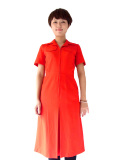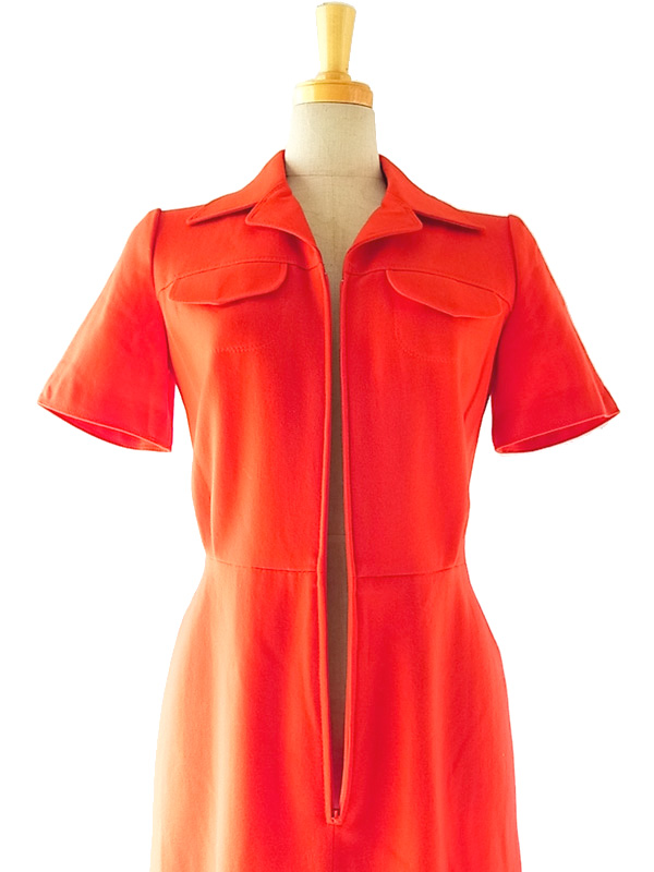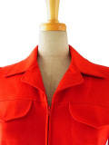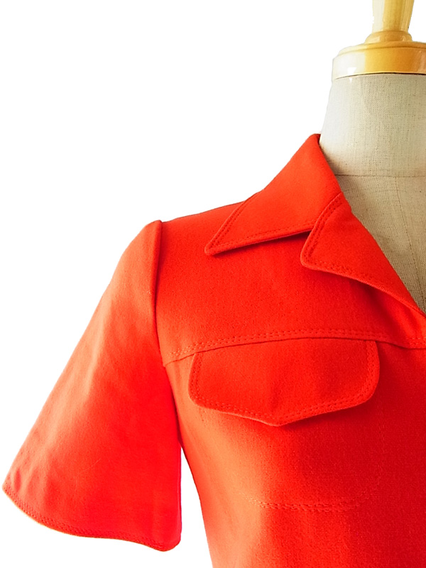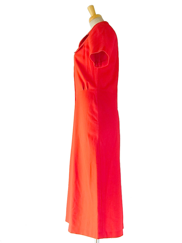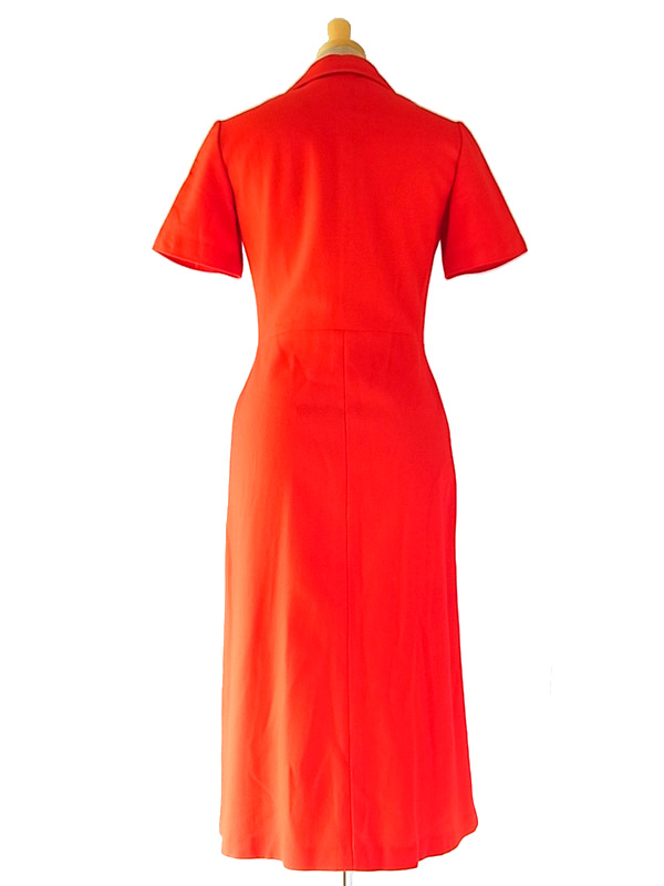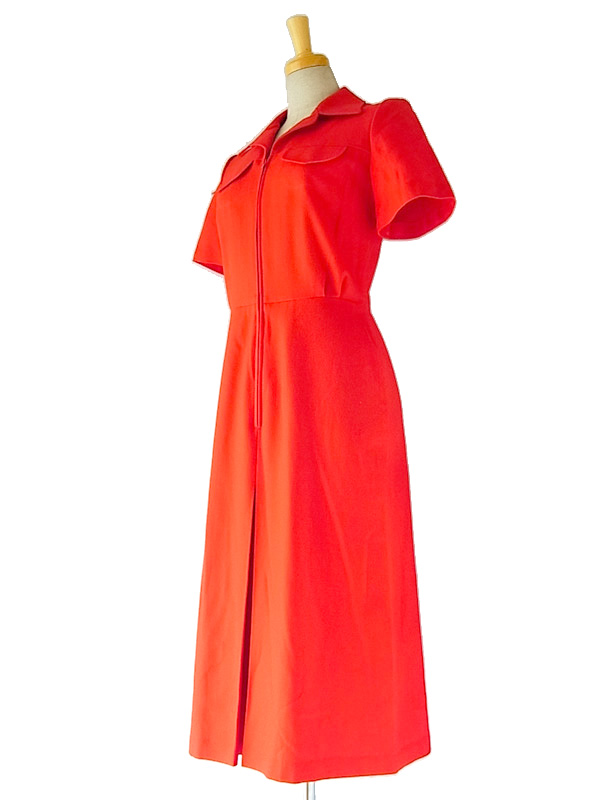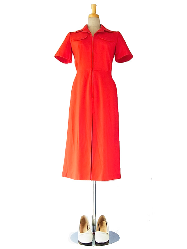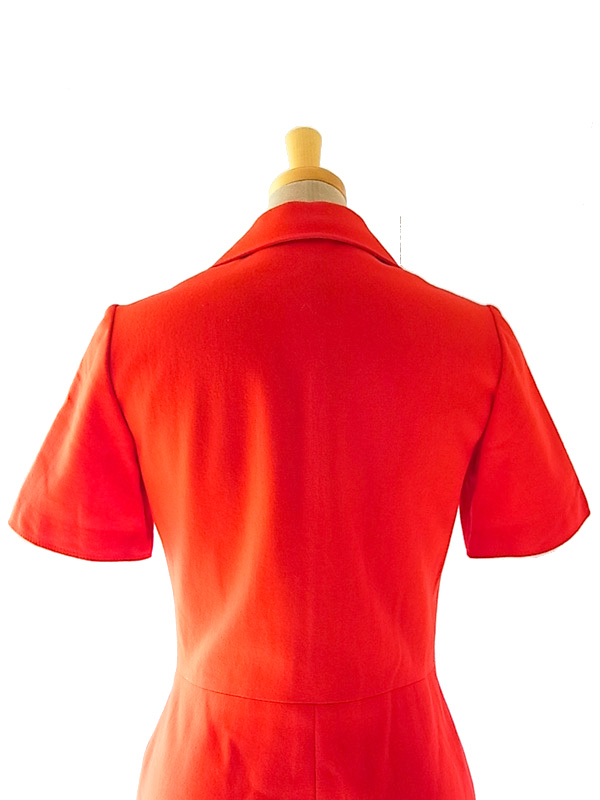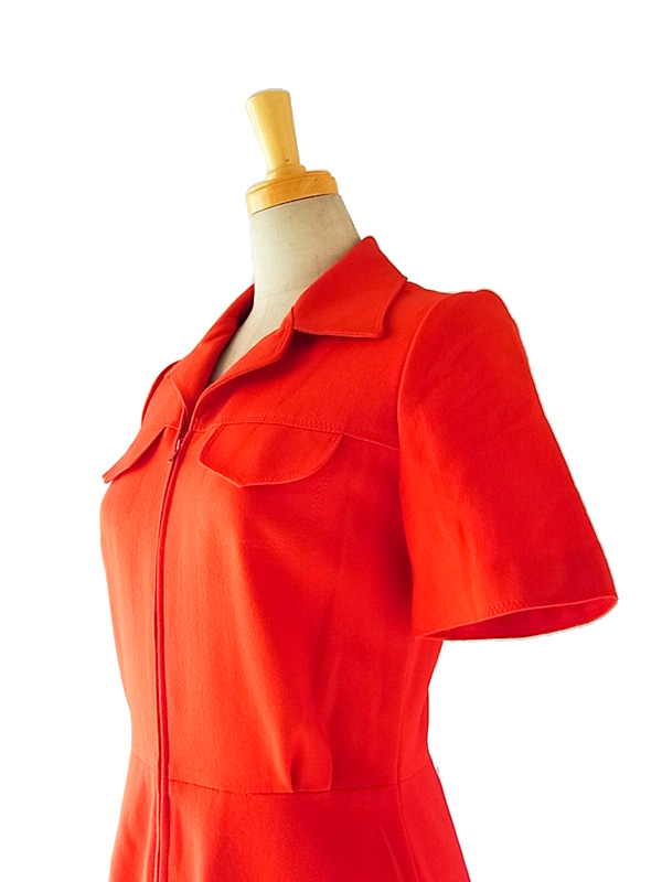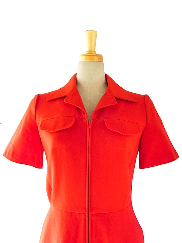 真っ赤なウール生地とマッチしたレトロポップラインがキュートなヴィンテージワンピース フランス買い付けの美しい配色のワンピース。細部までキュートな印象のヴィンテージならではの逸品。 フロントジップで美麗なラインを引き立てています。スカートのたっぷりとしたセンタープリーツも軽やかです。 胸元の飾りポケットも可愛らしいアクセントになっています。 素材はウール、軽く、暖かな仕立て。柔らかで、なめらかな肌触り、着心地も抜群です。 丈やサイズのバランスがよく、とても可愛らしいお品ものです。 デザイン、シルエットも申し分のないしっかりしたつくりになっており、状態も良好で、オススメです。
