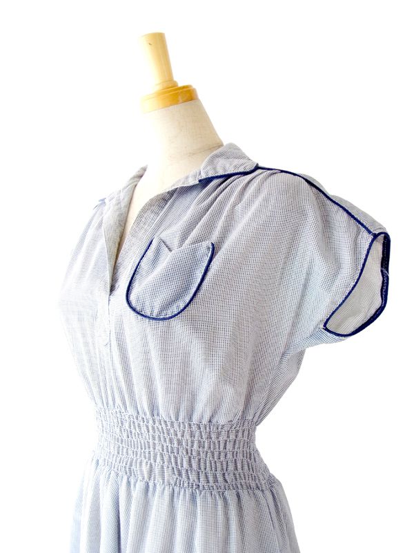 | □ 商品名・商品コード | フランス製 ホワイト X ブルー 千鳥格子風プリント ヴィンテージ ワンピース : 13FC411 |