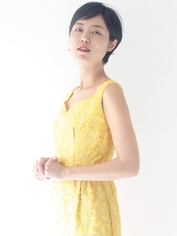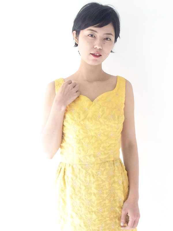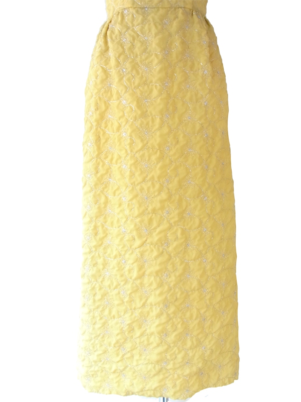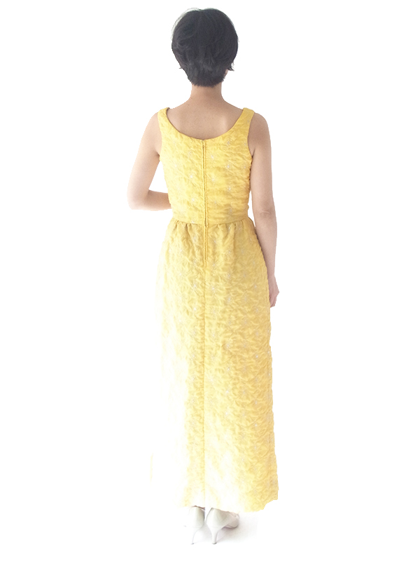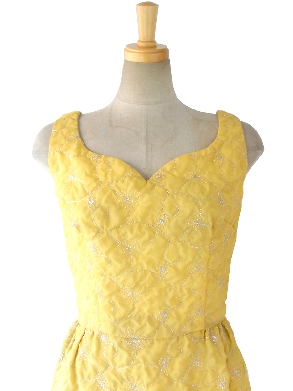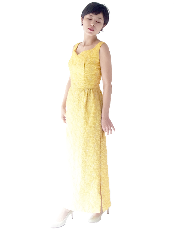 【送料無料】ロンドン買い付け 60年代製 レモン色 X シルバーラメ糸花柄刺繍 マキシワンピース 15OM402【ヨーロッパ古着】
