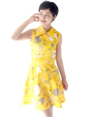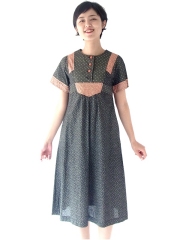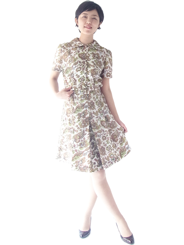 【送料無料】ロンドン買い付け 70年代製 ホワイト X グリーン・ブラウン レトロ柄 丸襟 共布ベルト付き ワンピース 17OM328【ヨーロッパ古着】