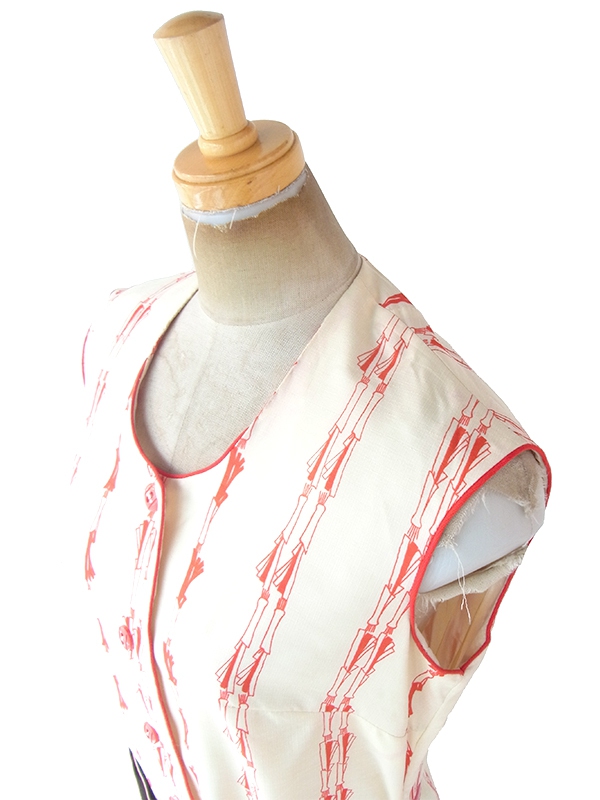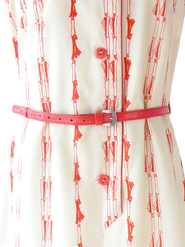 【ヨーロッパ古着】ロンドン買い付け 70年代製 クリーム色 X レッド レトロ柄 共布ベルト付き ワンピース 19BS200【おとなかわいい】