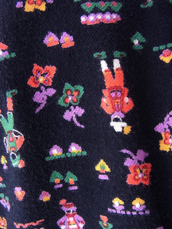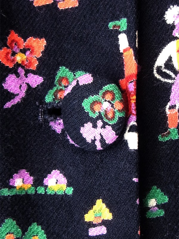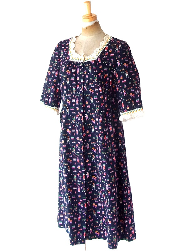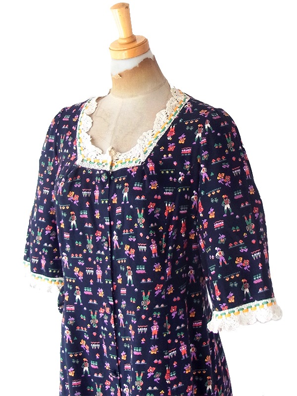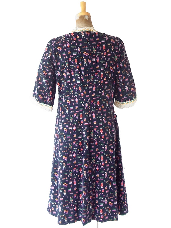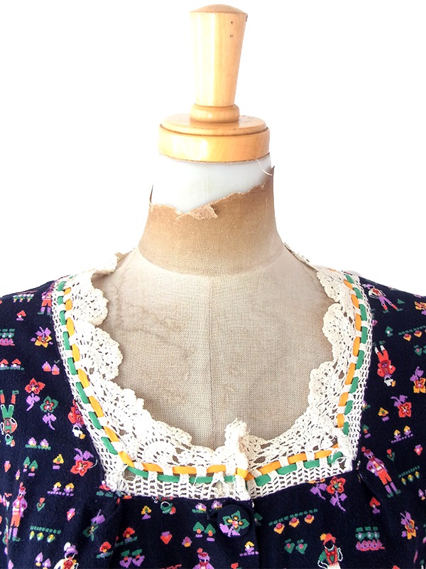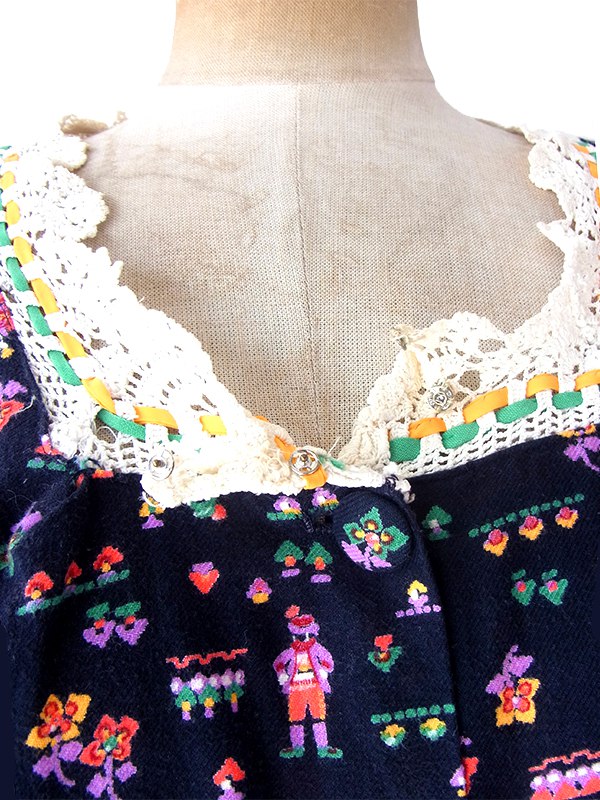【送料無料】フランス買い付け 60年代製 ブラック X カラフル チロル柄 レーステープ ポケット付き ワンピース 21FC112【ヨーロッパ古着】