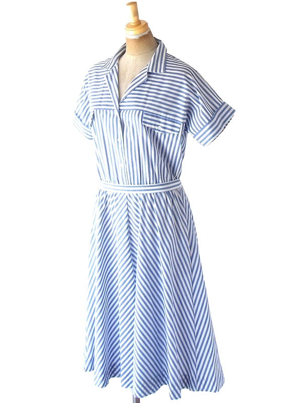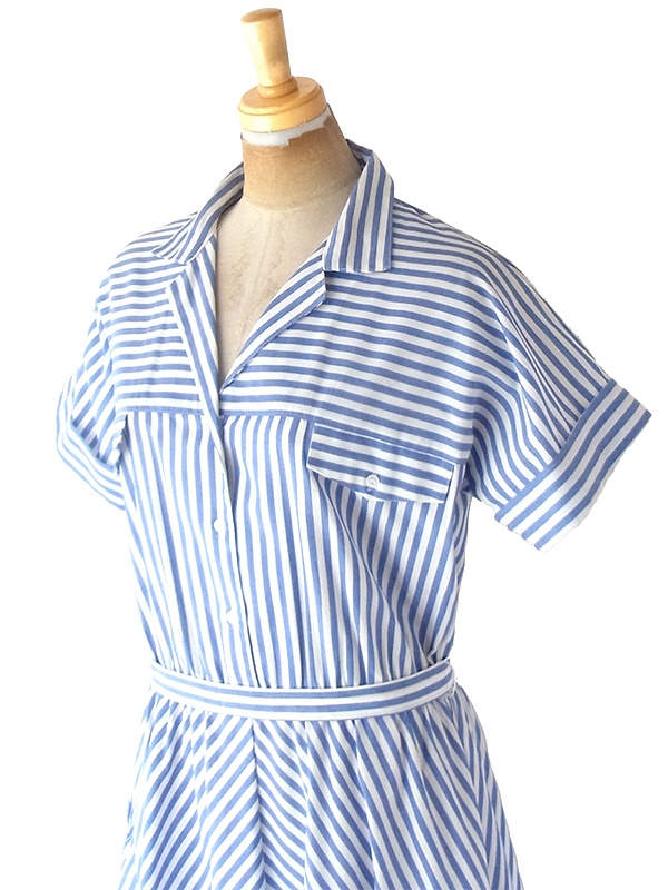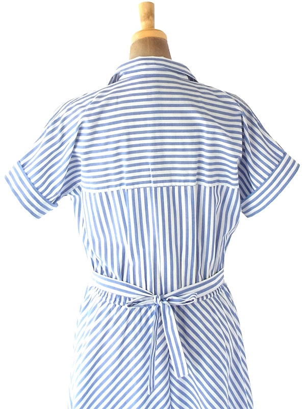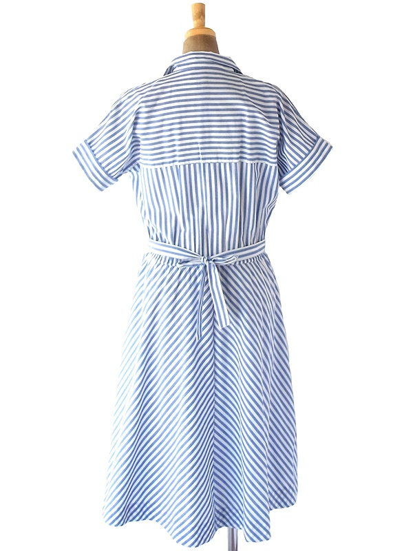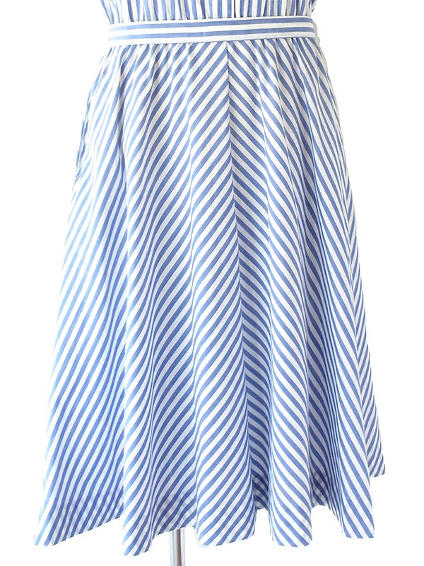 【送料無料】フランス買い付け 60年代製 水色 X ホワイト ストライプ 共布ベルト付き ヴィンテージ ワンピース 22FC100【ヨーロッパ古着】