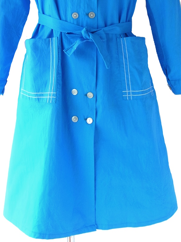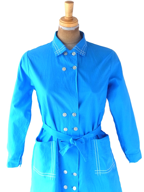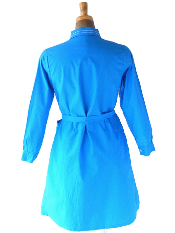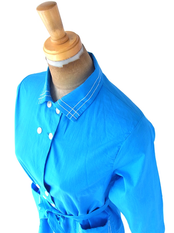 【送料無料】フランス買い付け 60年代製 スカイブルー X ホワイトステッチ ポケット・共布ベルト付き ワンピース 22FC103【ヨーロッパ古着】