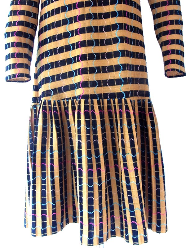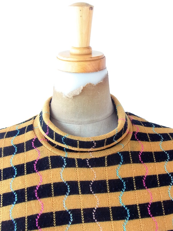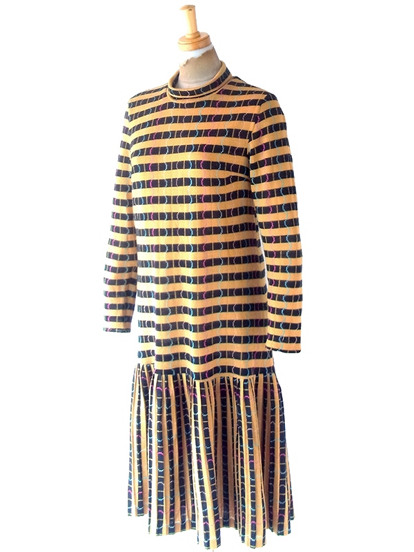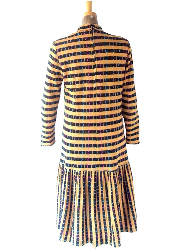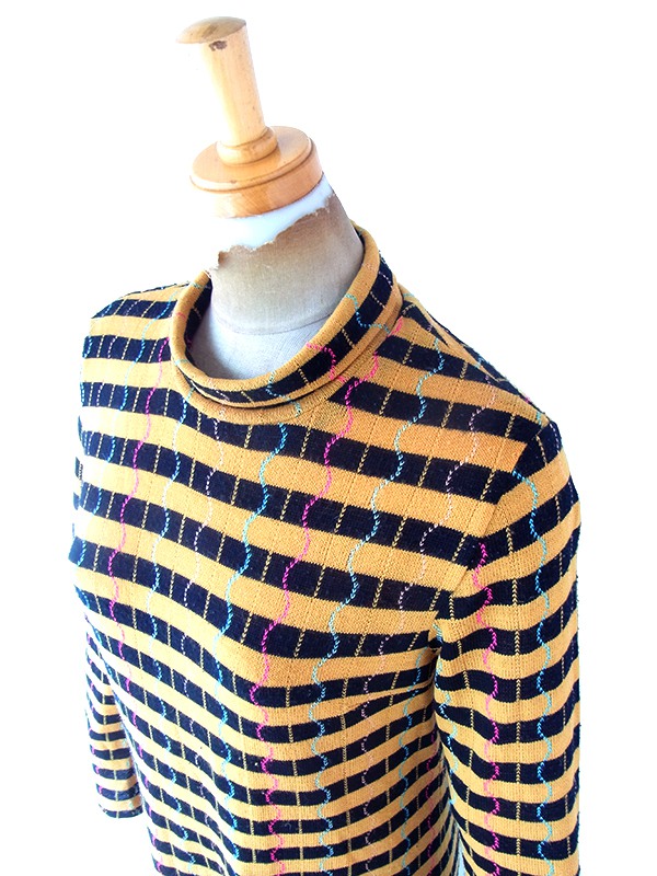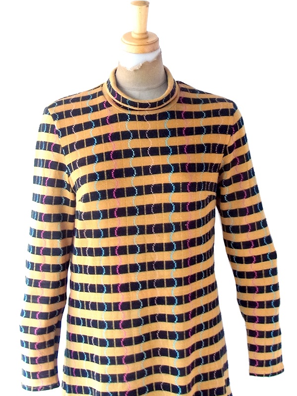 【送料無料】フランス買い付け 60年代製 イエロー X ブラック ボーダー カラフル波模様 ヴィンテージ ワンピース 22FC305【ヨーロッパ古着】