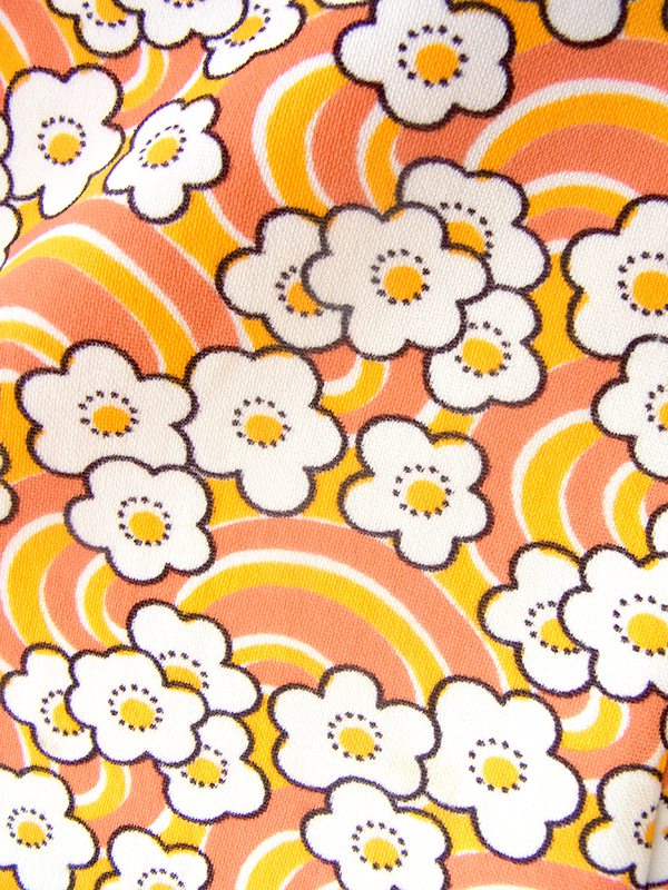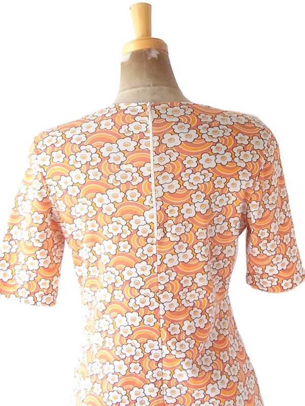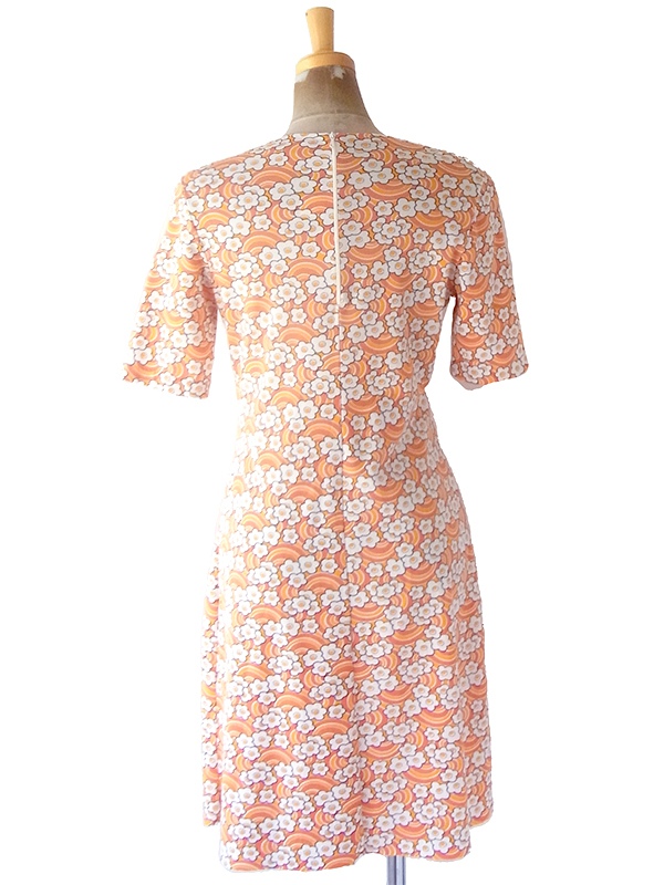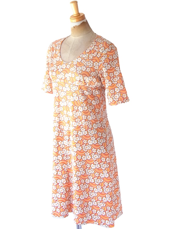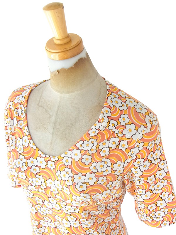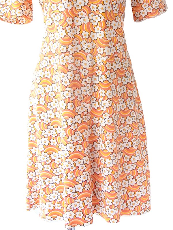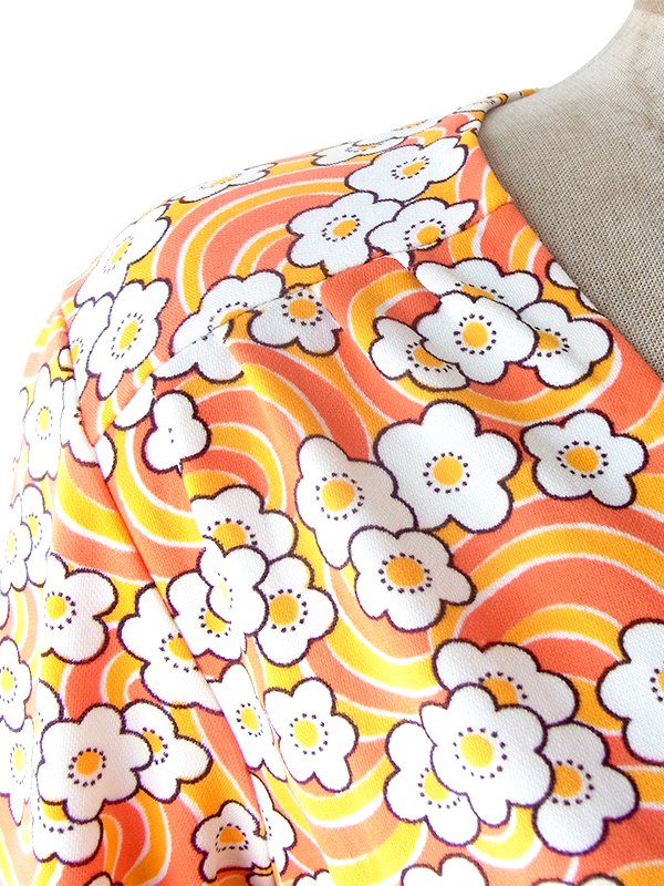 【送料無料】70年代フランス製 オレンジ X イエロー・ホワイト レトロ花柄 ヴィンテージ ワンピース 23FC124【ヨーロッパ古着】