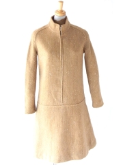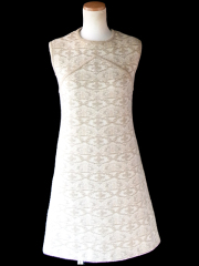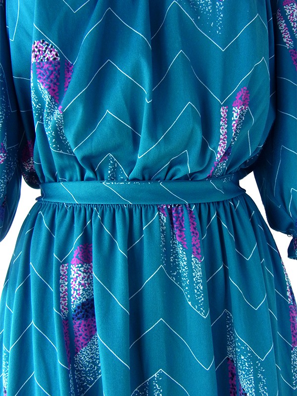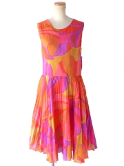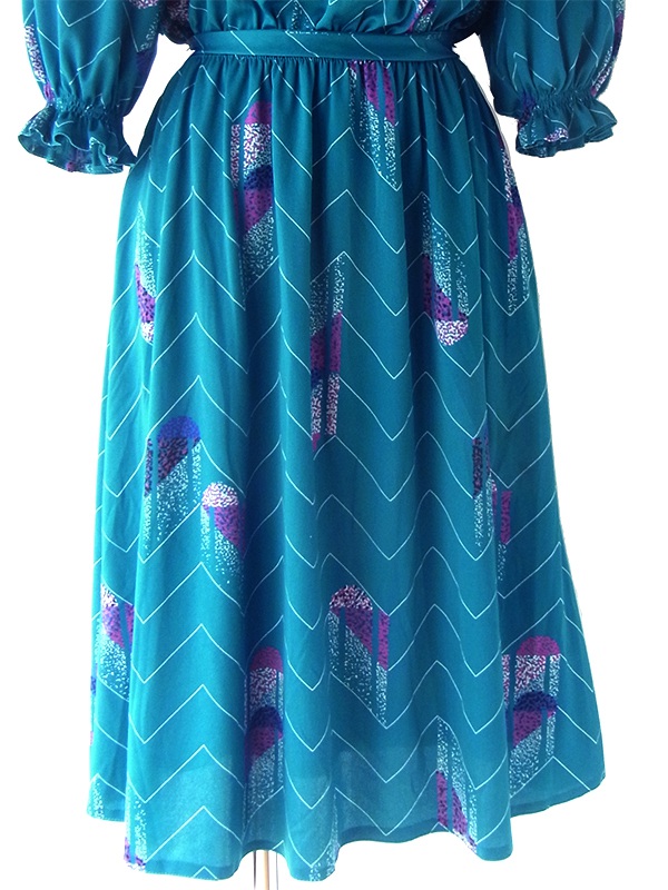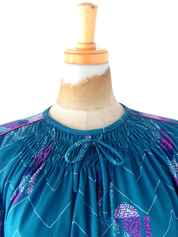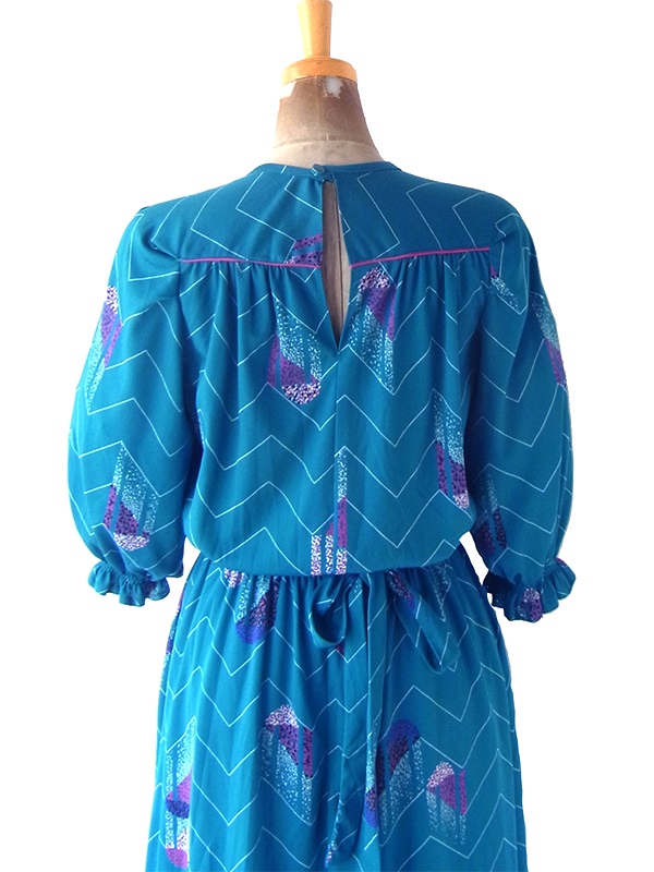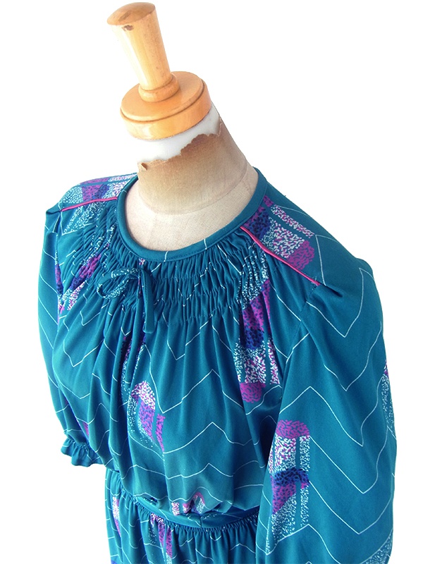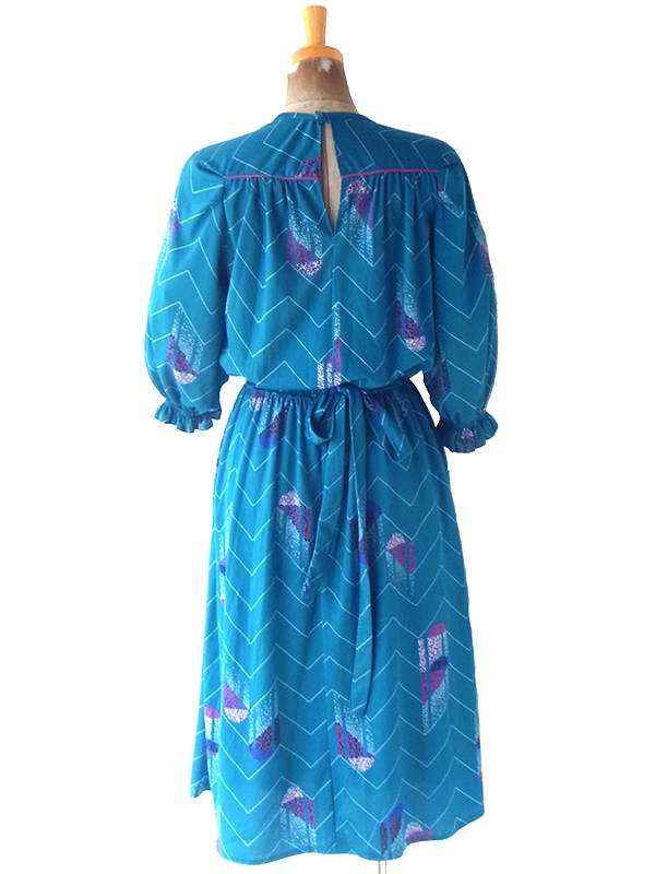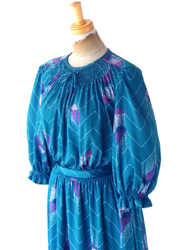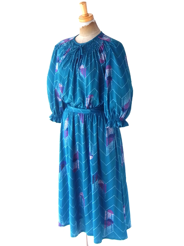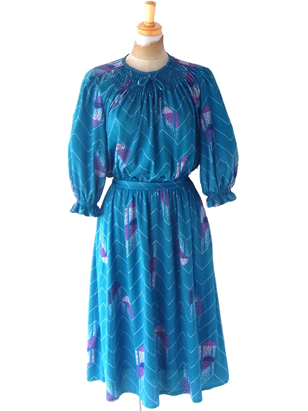 【送料無料】フランス買い付け 70年代製 マリンブルー X レトロ柄 シャーリング ヴィンテージ ワンピース 24FC013【ヨーロッパ古着】