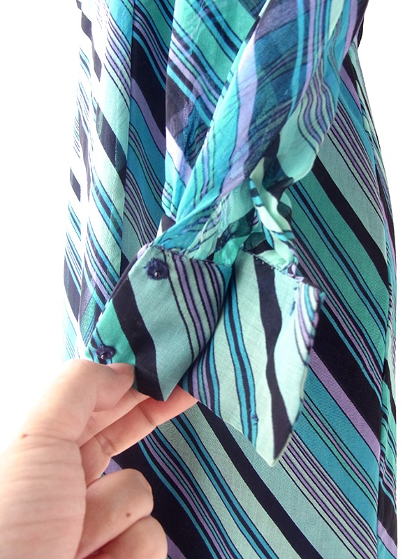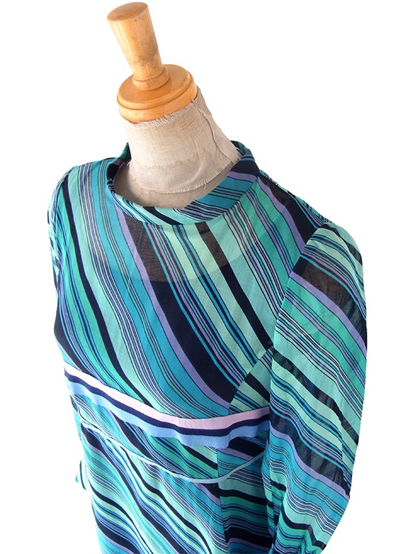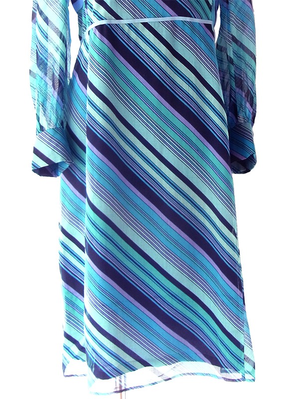【送料無料】70年代製 水色 X パープル・ブラック ストライプ ピンクリボンテープ ワンピース 24WB008【レトロ古着】