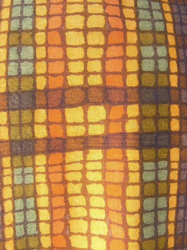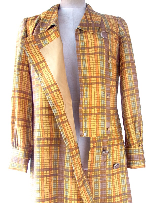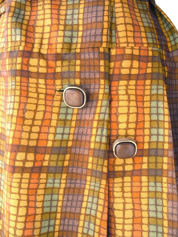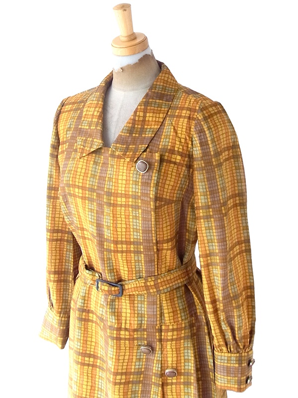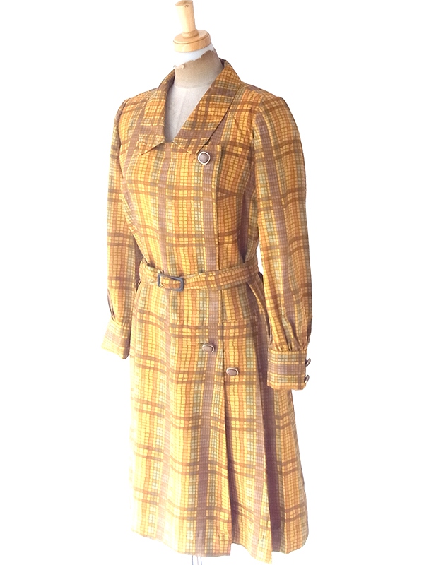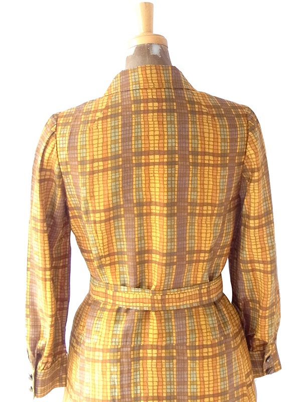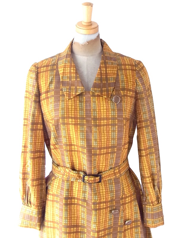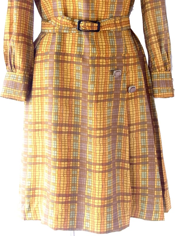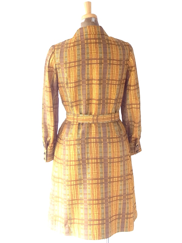 【送料無料】70年代日本製 オレンジ Xブラウン X イエローブロックチェック 共布ベルト付き ワンピース 24WB023【昭和レトロ】