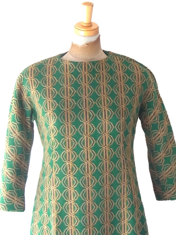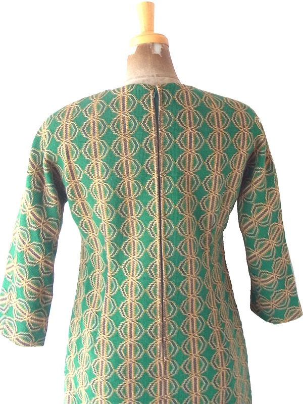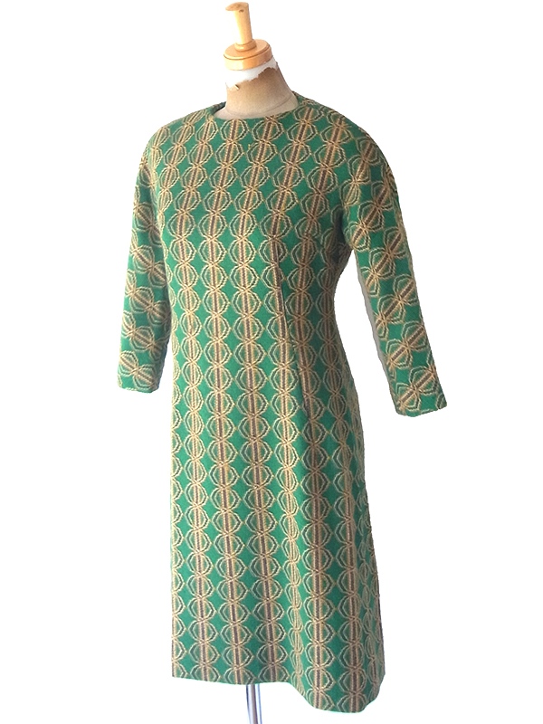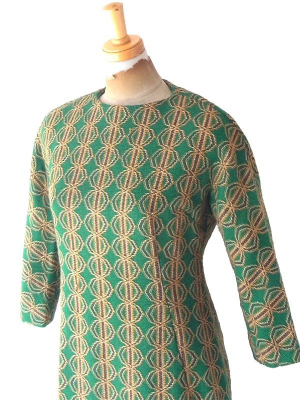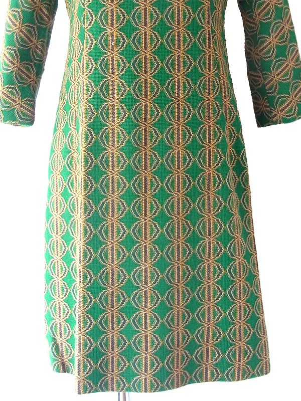 【送料無料】60年代製 グリーン X イエロー・ブラウン 幾何学模様 ヴィンテージ ワンピース 24WB052【レトロ古着】
