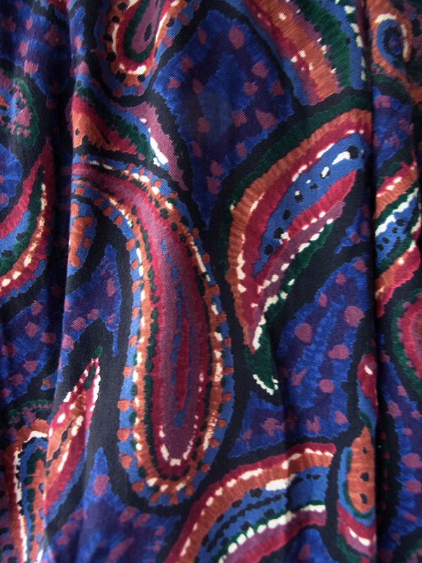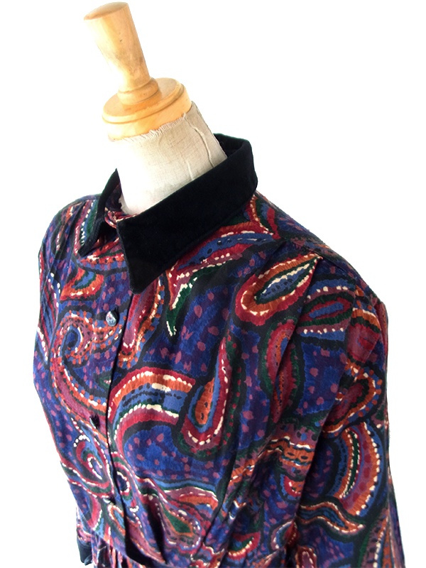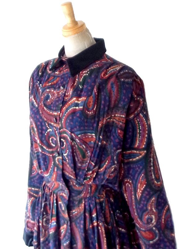 【送料無料】70年代フランス製 ネイビー X ペイズリー柄 ベルベットカラー ギャザー ヴィンテージ ワンピース 26FC003【ヨーロッパ古着】