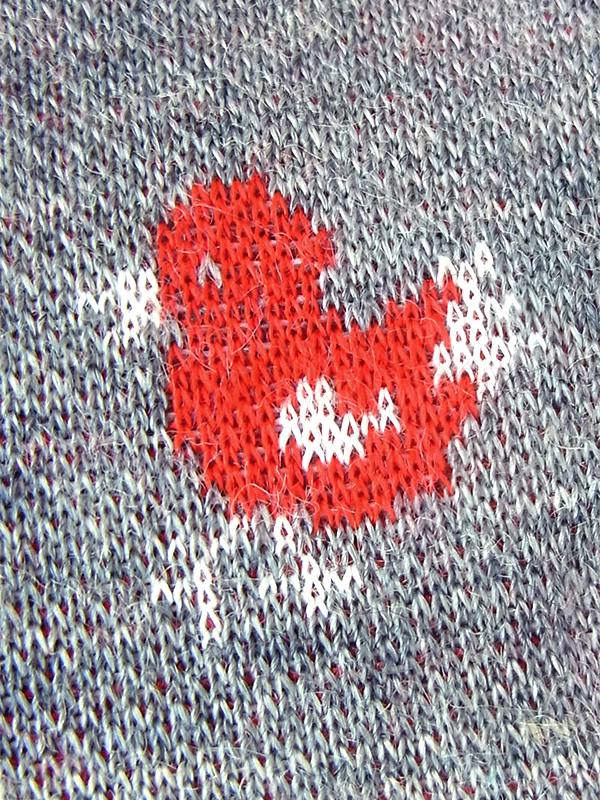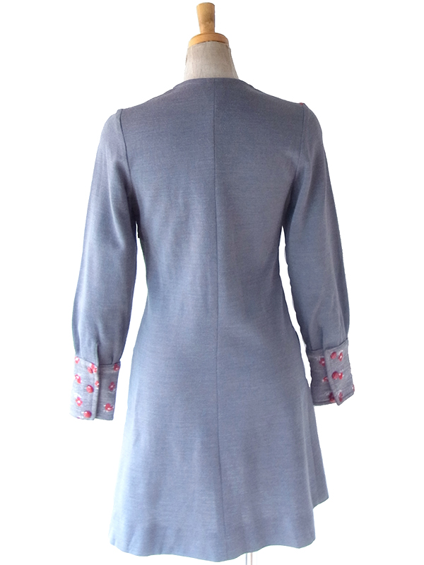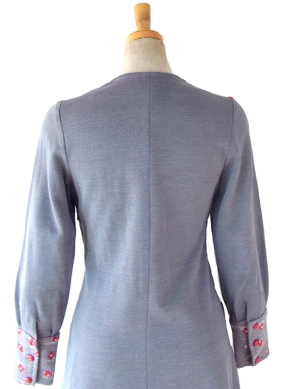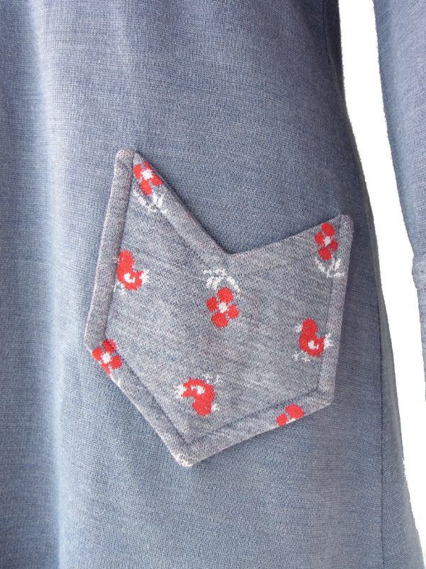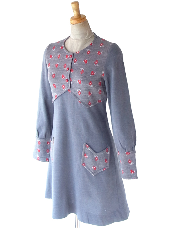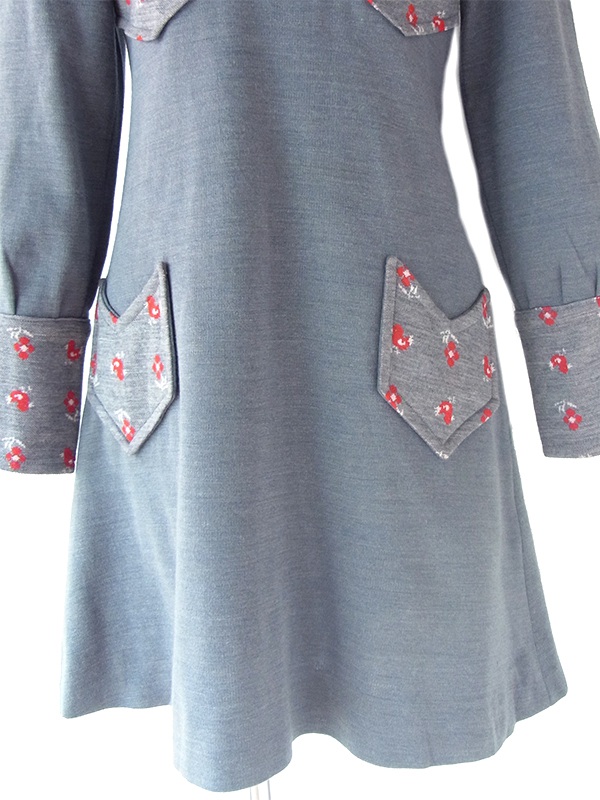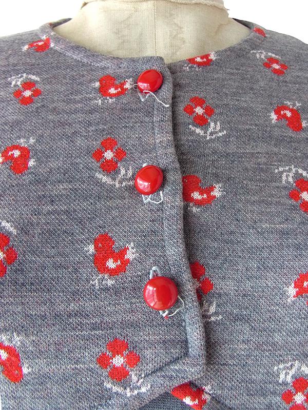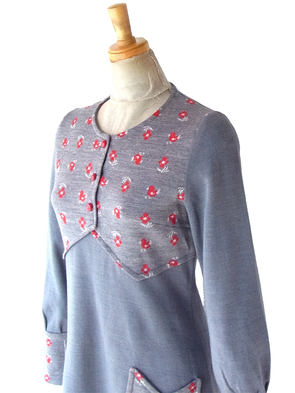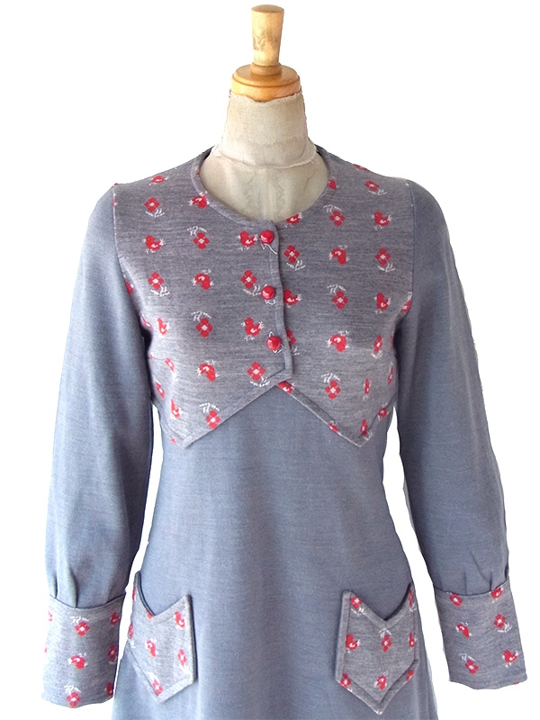 【送料無料】フランス買付け 60年代製 グレー × レッド 小鳥・小花柄 切り替え ワンピース 26FC004【ヨーロッパ古着】